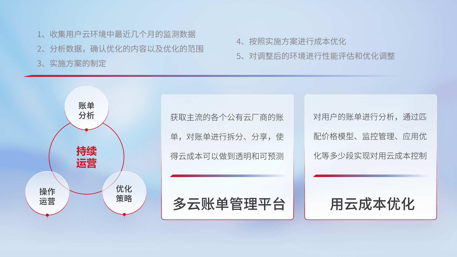 通过多云纳管,,,以统一的资源数据模型把客户的云资源进行抽象和封装,,,,进而实现对多云资源的统一操作,,,保障云资源管理的可靠性、、、、稳定性与可用性。。量身定制化运维内容,,配置、、、、开发运维、、补丁管理、、备份、、、、监控、、、认证和访问管理、、、、审计和日常巡检等,,,保障在用云过程中的可靠度,,稳定度以及高可用率。。。。