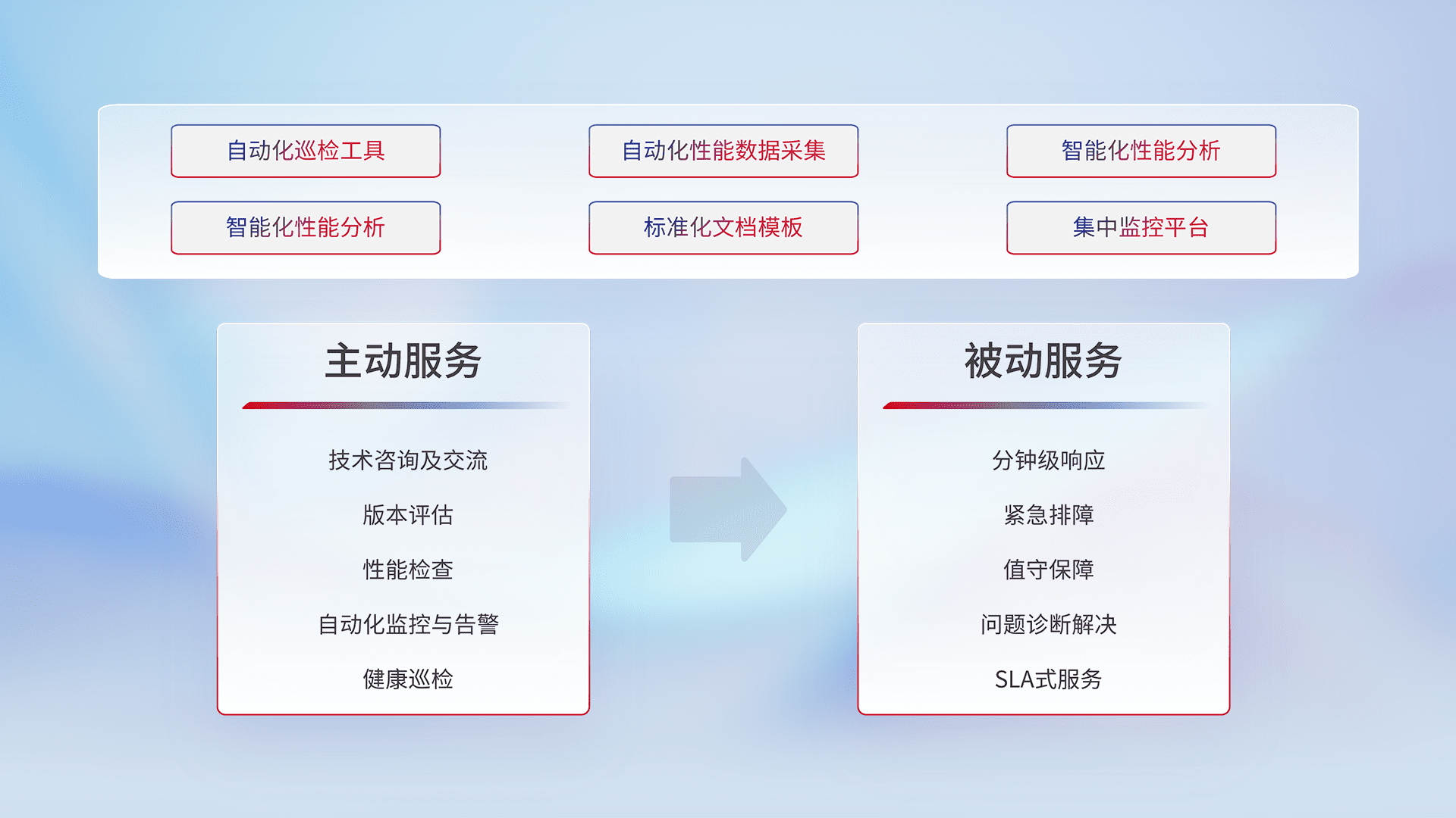 智能化工具和标准化文档,,,,保障服务质量,,提供主动服务(包含技术咨询、、、版本评估、、、、性能检查、、、、自动化监控与告警、、、健康巡检)和被动服务包含(分钟级响应、、、紧急排障、、、值守保障、、问题诊断解决、、SLA服务)。。