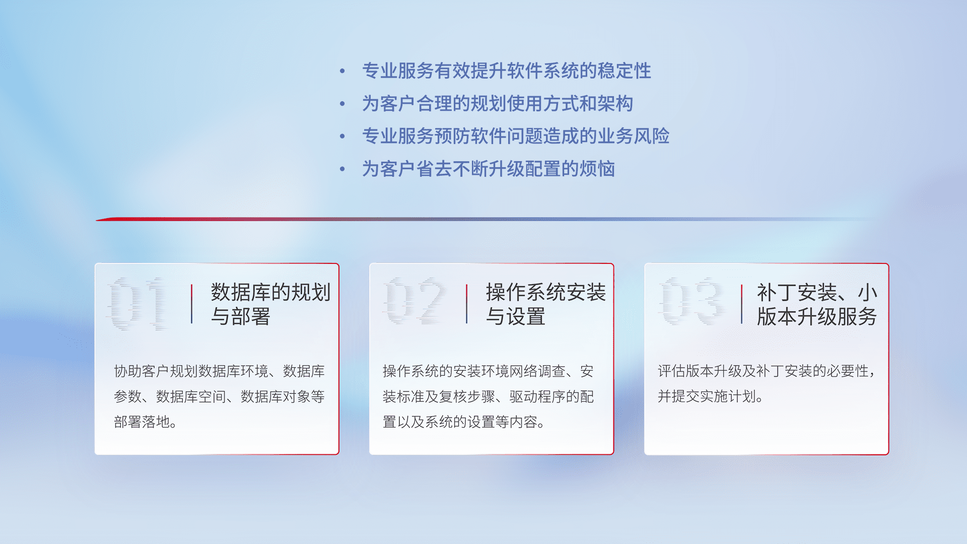 为客户提供软件规模升级、、、快速部署、、、按需配置的专业服务,,,,从数据库的规划与部署到操作系统的安装与设置,,再到补丁安装和小版本升级提供支持。。。