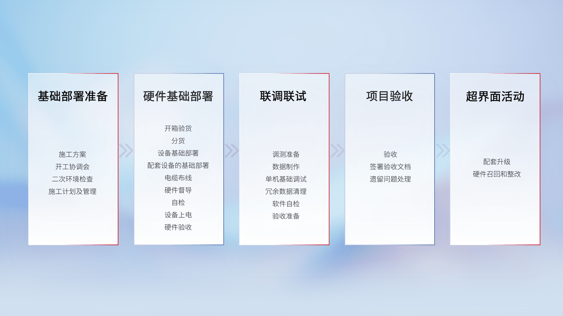 从基础部署准备、、、、硬件基础部署、、联调联试、、、、项目验收、、越界面活动的全过程可追溯,,,保证施工质量和进度。。。