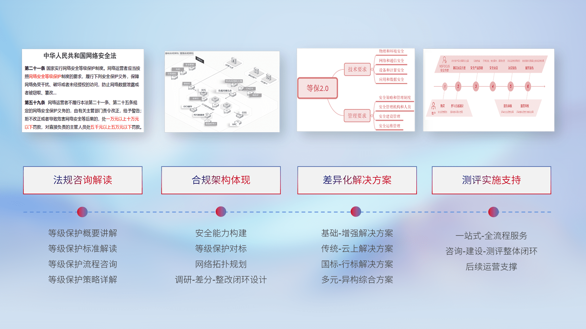 通过专业的法律咨询解读、、合规架构体现、、差异化解决方案、、测试实施支持等服务,,,,为客户量身打造等保合规体系。。。。
